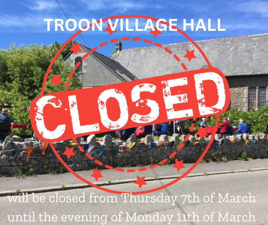 Dear Troon, as the next exciting stage of the hall refurbishment begins the existing hall will be closed from the 27th of May. As soon as we have a re-opening date we will let you now.