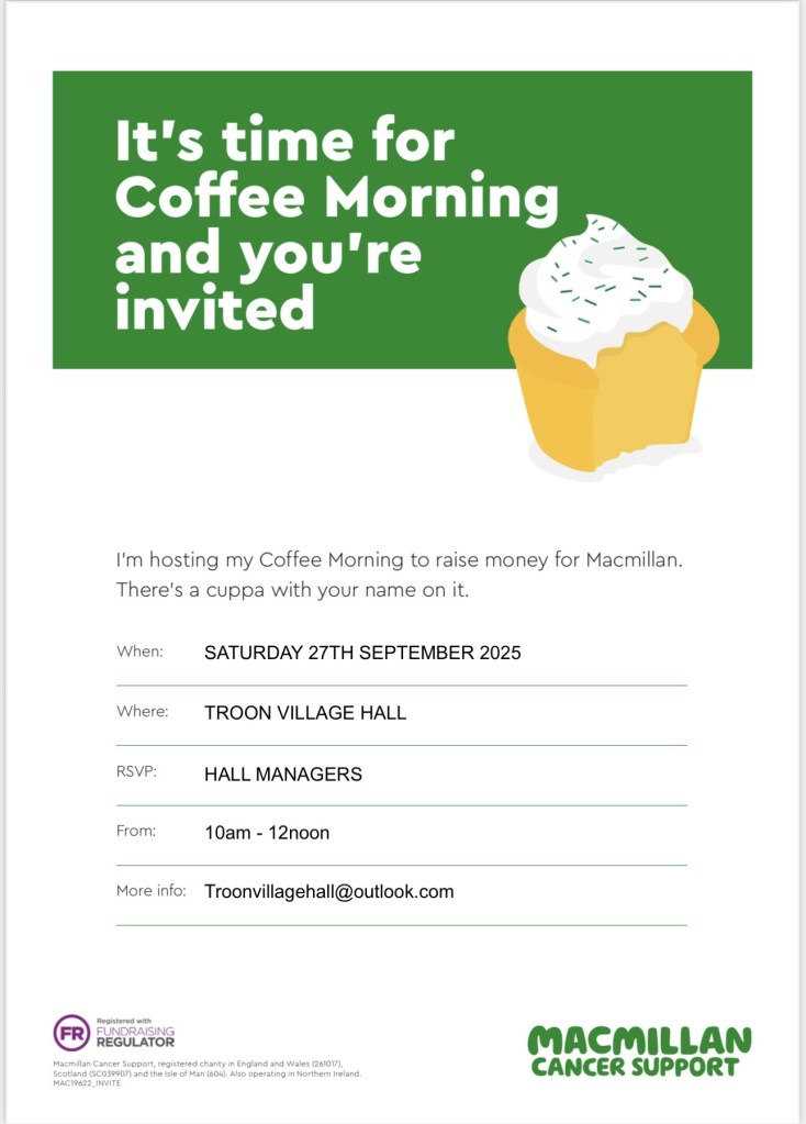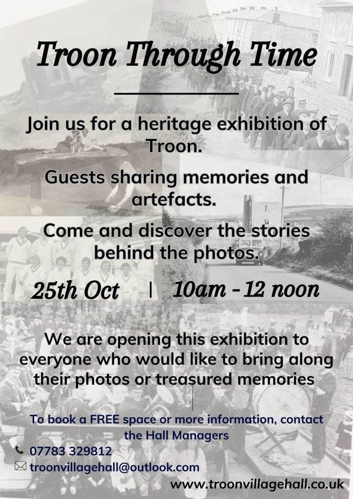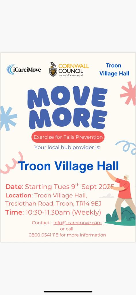 Troon village hall is a community resource which aims to hold events and experiences for all ages and abilities. See below a selection of what’s on at the moment. If you need more information, have an idea for a club, would like to volunteer to help at a club, then please get in touch.
